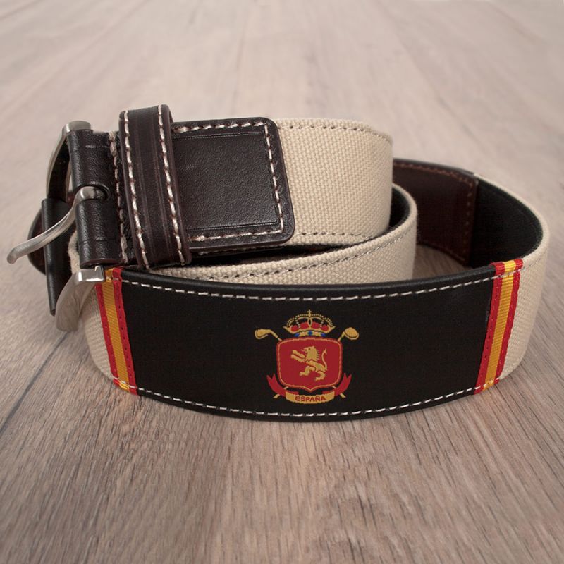 Cinturón canvas con hebilla y extremo forrados en cuero vacuno y pespunte a contraste.