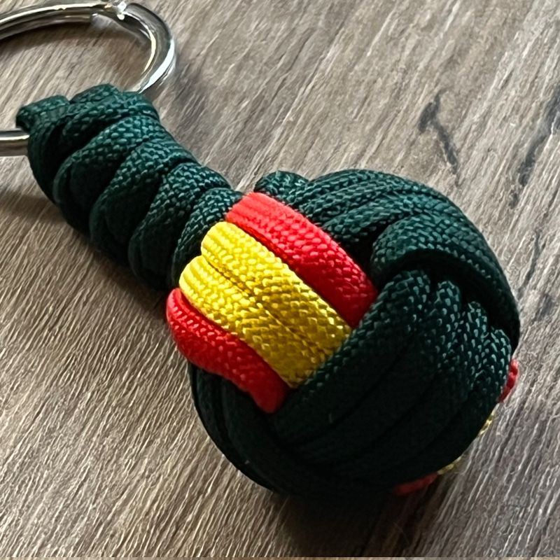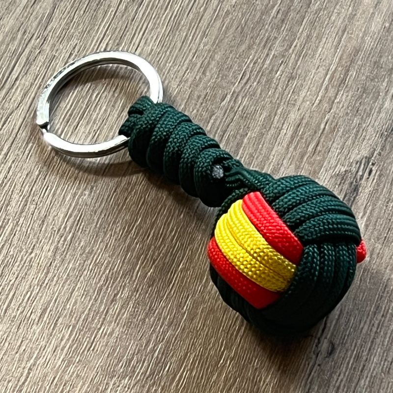 Llavero de bola de cordón trenzado verde oscuro con los colores de la bandera de España en su interior.