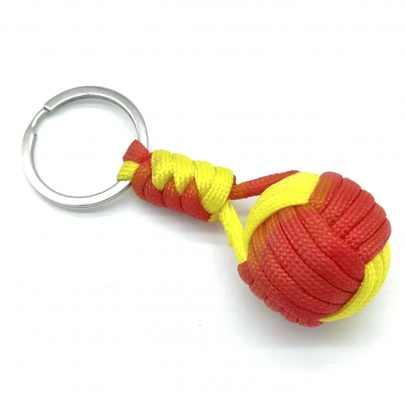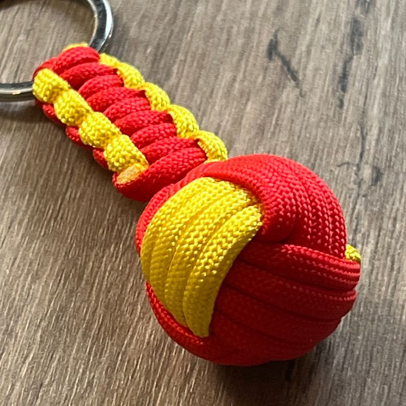 Llavero de bola de cordón trenzado que incorpora los colores de la bandera de España en su interior.