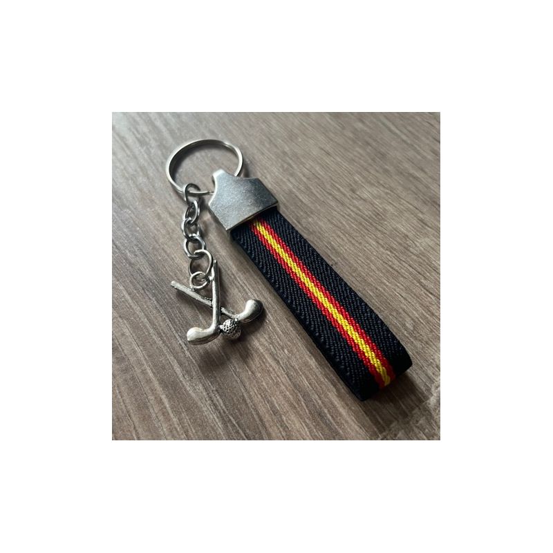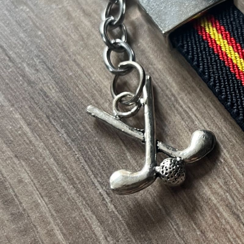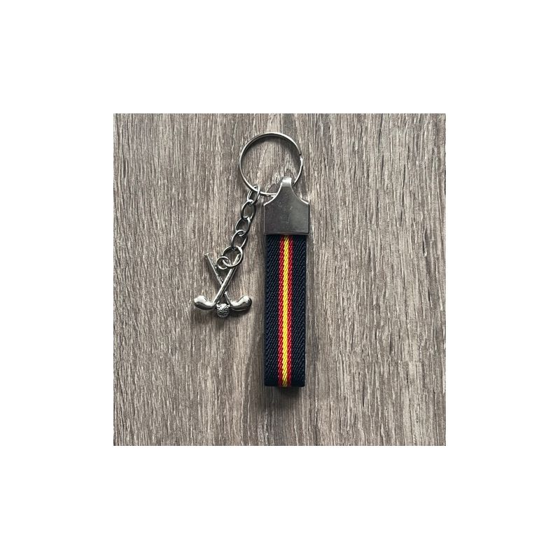 Llavero elástico ESPAÑA con colgante decorativo de palos y bola de golf. Anilla metálica de sujeción segura para llaves o para bolsa de golf.