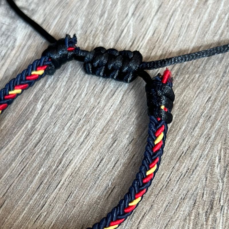 Pulsera artesanal ajustable marino de cordón trenzado con finos detalles de la bandera de España.
