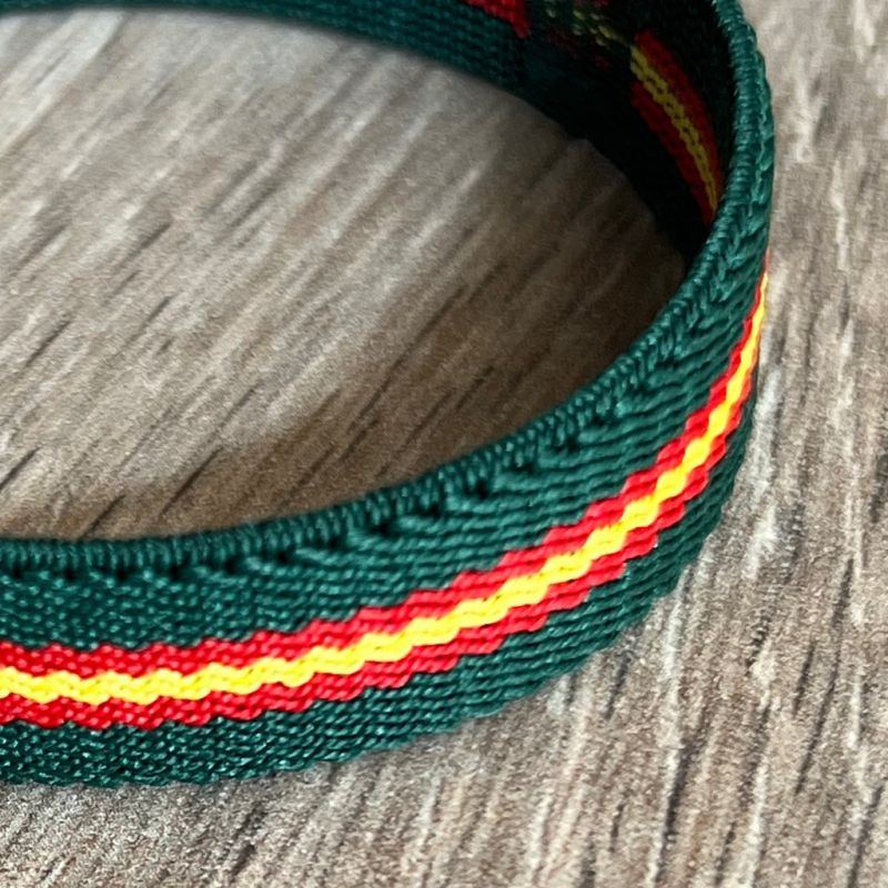 Pulsera elástica verde oscuro detalle ESPAÑA integrado por todo el largo de la pulsera.