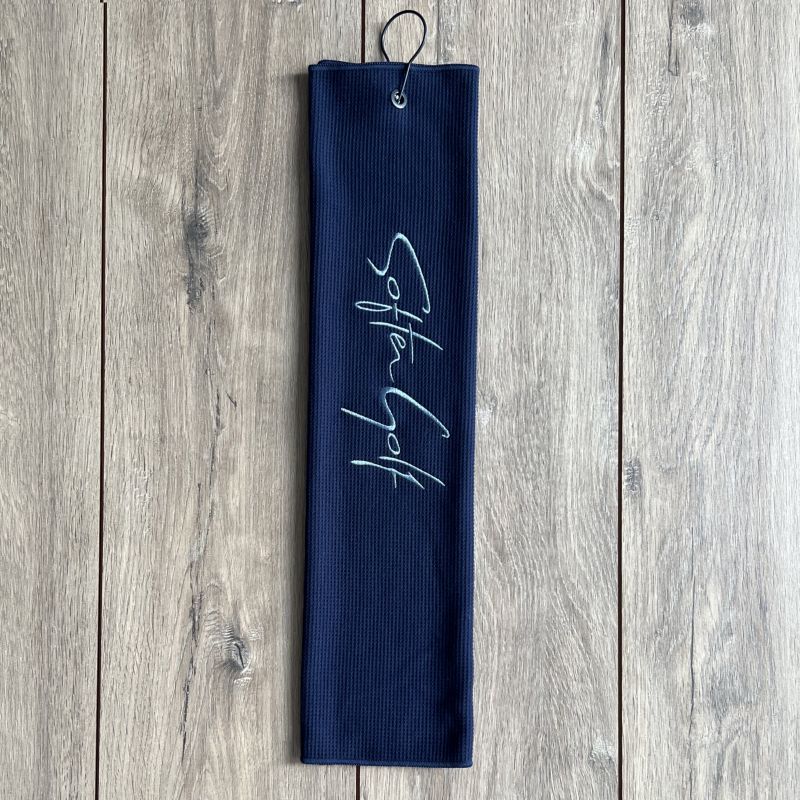 Bordado 'SOFTER GOLF' en alta calidad, la toalla incluye un resistente clip mosquetón al tono de diseño clásico y tradicional, el de siempre - a diferencia de los mosquetones de montaña de estos últimos años, no tan elegantes -, permitiendo colgar la toalla en la bolsa de golf o en el cinturón.