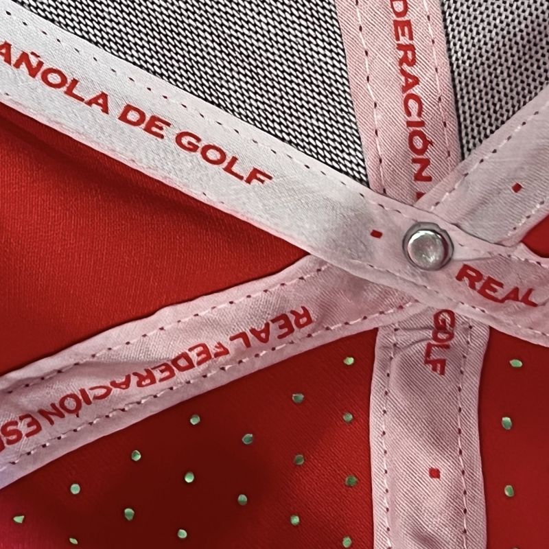 En el interior, las cintas transversales personalizadas con la inscripción “REAL FEDERACIÓN ESPAÑOLA DE GOLF” aportan un acabado premium distintivo.